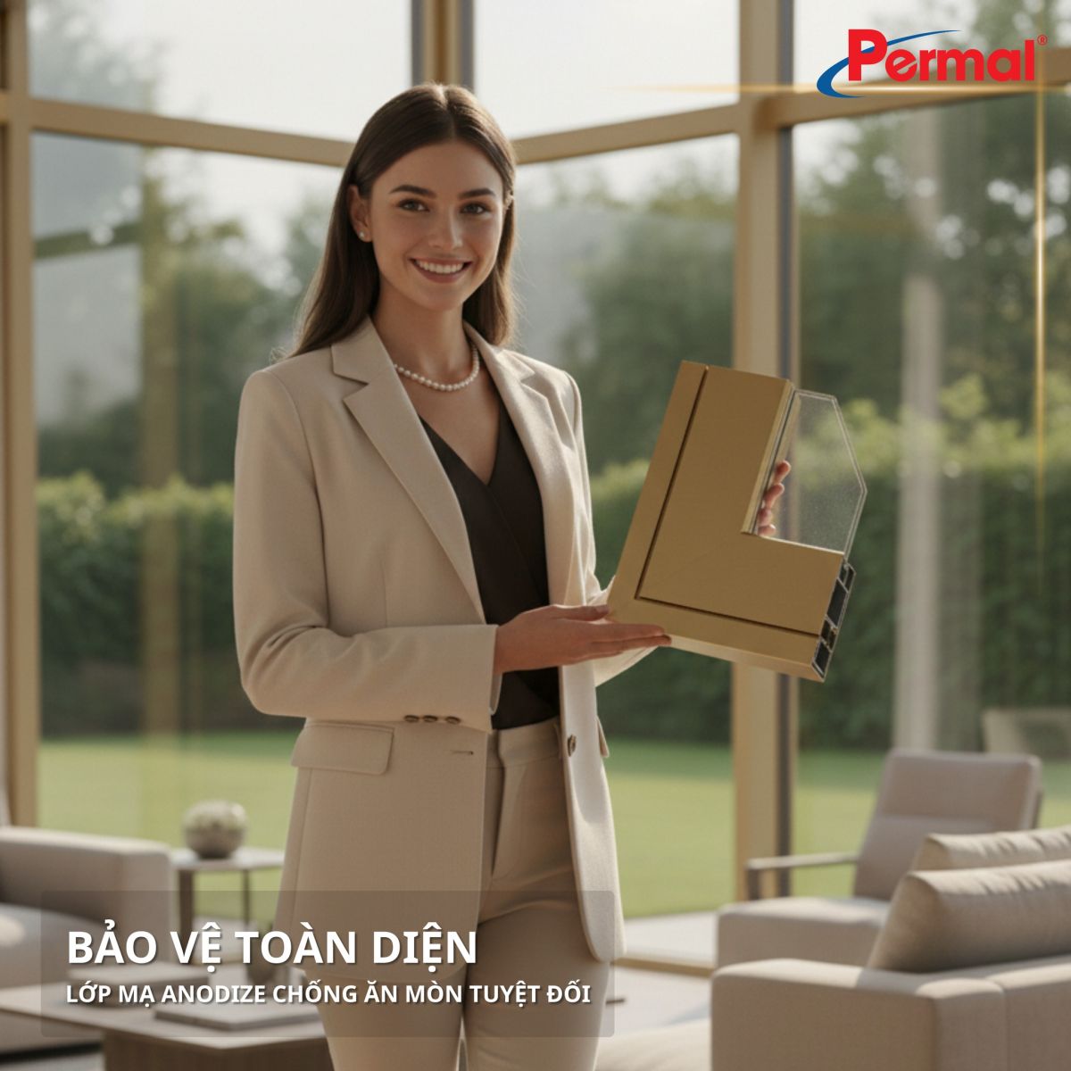 Permal sử dụng hợp kim nhôm 6063-T6, dòng vật liệu được ứng dụng phổ biến trong ngành nhôm kiến trúc cao cấp nhờ khả năng chịu lực tốt và tính ổn định cao. Điểm khác biệt của Permal nằm ở công nghệ xử lý bề mặt anodizing điện phân, tạo lớp oxit nhôm bảo vệ gắn chặt trực tiếp với nền vật liệu, không bong tróc như các phương pháp sơn phủ thông thường.