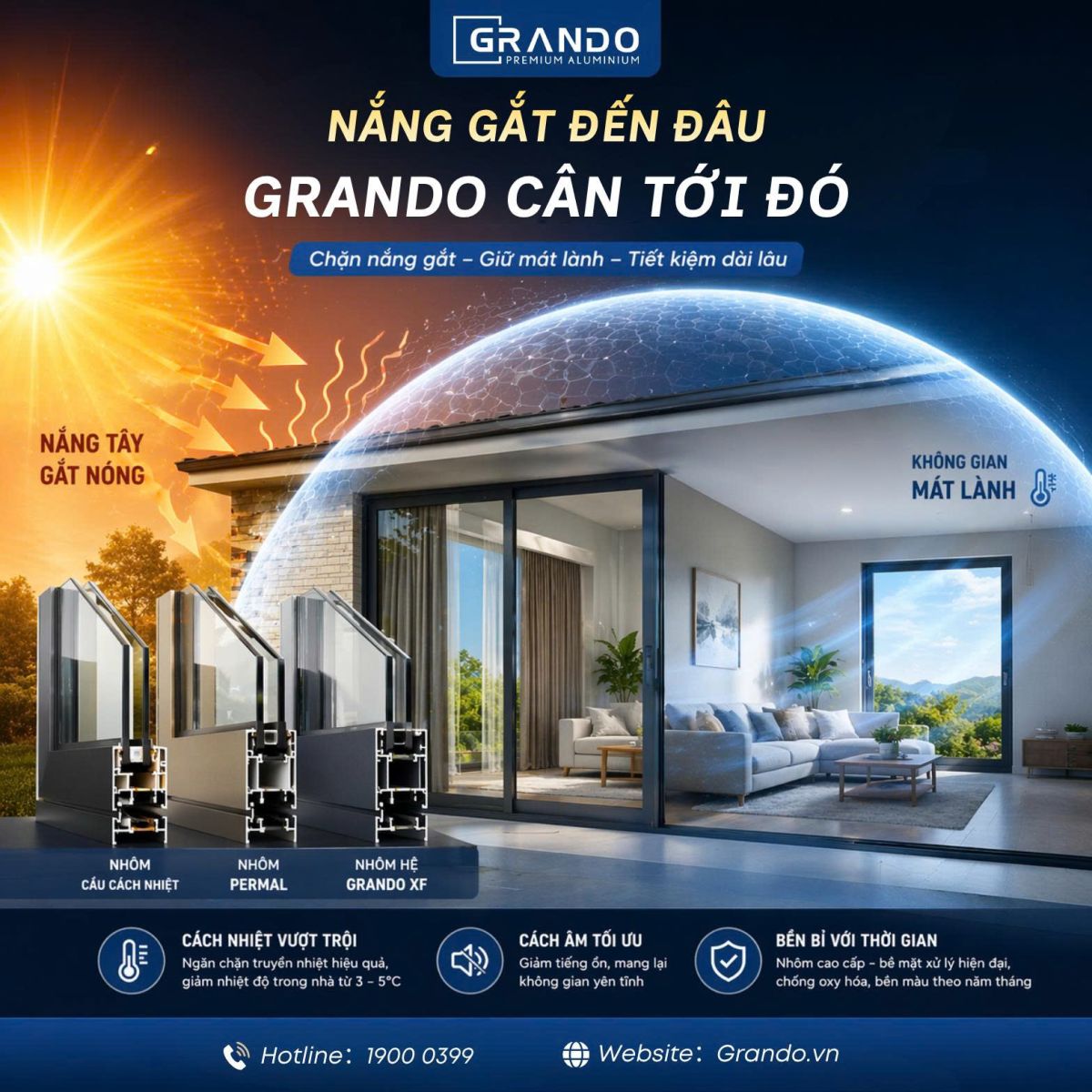 Dưới đây là 3 hệ nhôm Grando được nghiên cứu để xử lý bài toán chống nóng cho nhà hướng Tây, theo từng cấp độ hiệu năng và nhu cầu sử dụng: