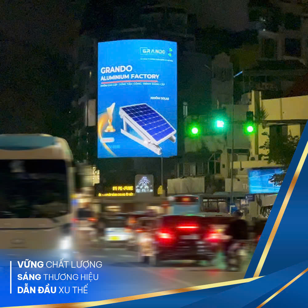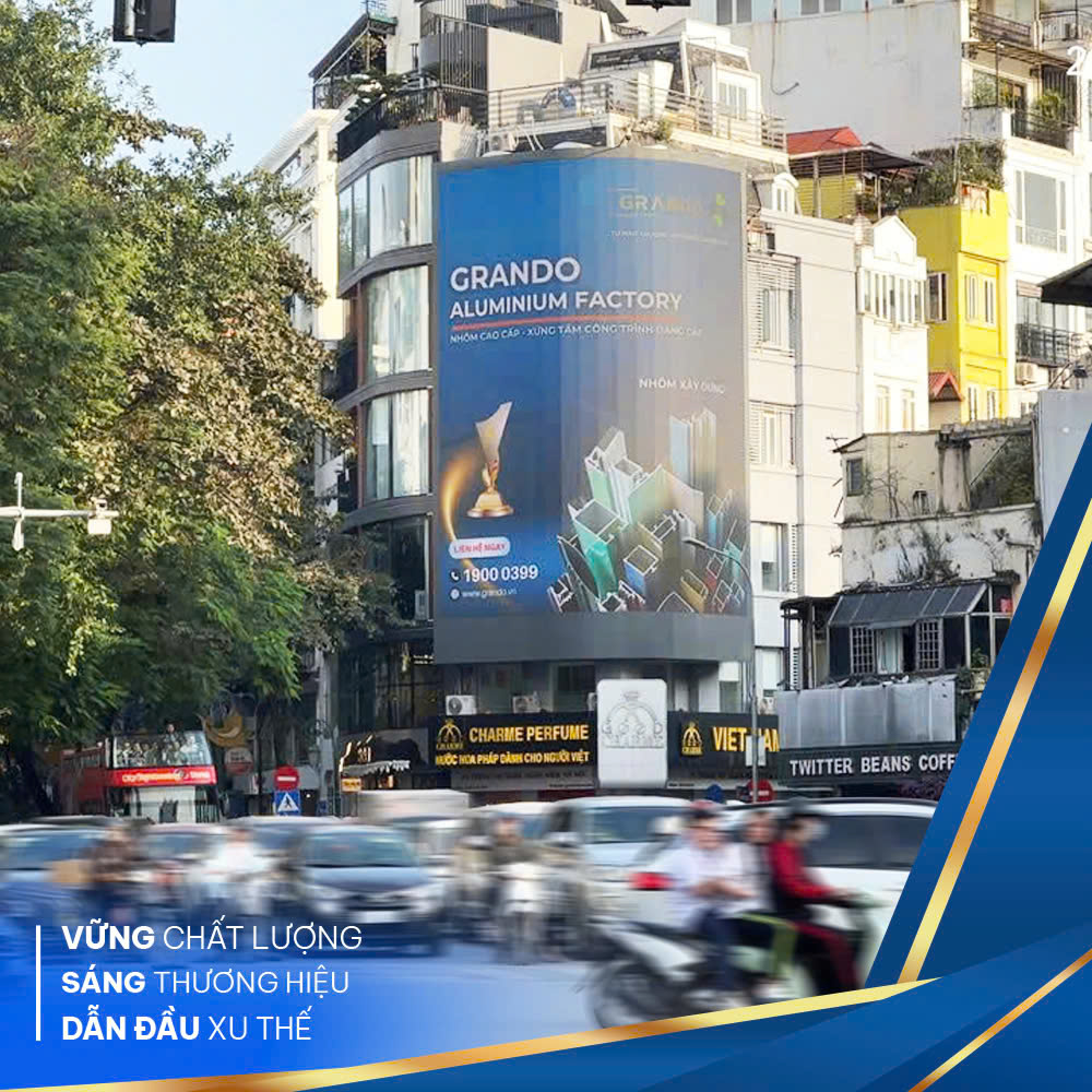 Hệ thống biển quảng cáo được triển khai đồng bộ về hình ảnh, thông điệp và nhận diện, phản ánh rõ triết lý phát triển của Grando: vững chất lượng trong sản xuất, bài bản trong xây dựng thương hiệu và quyết liệt trong mục tiêu dẫn đầu xu thế ngành nhôm Việt Nam.